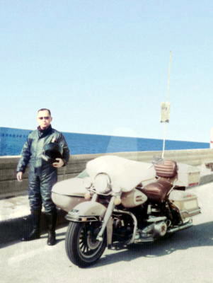 四半世紀前の私と当時の愛車ハーレー(正式名 ハーレーダビッドソン エレクトラグライド エフ エル エッチ クラシック ウイズ サイドカー)です。永い名前ですね。(^^)ご笑覧下さい。♪僕の心は舞子が浜よ、他に(木)気はない(松)待つばかり…♪(商大小唄より)と唄われた舞子が浜で未だ明石海峡大橋のない25年前写したものです。四半世紀の年月は私だけでなく写真をも随分老化させてしまいました。(;;)