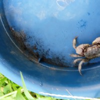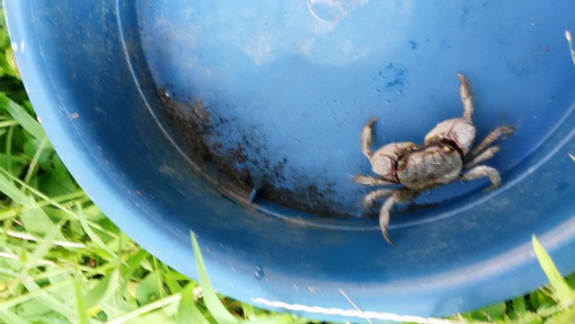 此奴はうちの前の溝の割れ目に棲息している雑種の蟹だがこんなに大きいのは珍しい、大半は1cm程度だ。昔は弁慶ガニが沢山棲んで居たが水質が悪化し私の中学生の頃に死に絶え、今では此の汚い色の蟹が溝の底の割れ目に無数に棲んで居り、通り掛かる保育園児達の興を誘い帰宅を急ぐ母親達を苛立たせている。住宅地のド真ん中の溝に蟹が棲んで居るなんて信じられない方も多いと思うが、溝には生活排水ではなくうちの裏の土手の下から湧く地下水が溝に流れ込むせいなんだ。