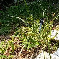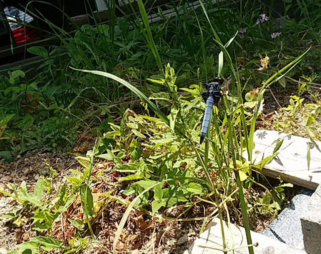 今年も庭の瓢箪池にトンボが来てくれました。シオカラトンボに良く似た黒いトンボで昨年まで来ていたムカシトンボとは少し違っています。近辺10kmには田圃も池もないのにどこから来たのかしら?池の水の香りって人間には分からないけどトンボには感知できるのが不思議でなりません。雑草に巣食っている蚊を食べたりして1時間ほど遊んで居てやがて居なくなりました。来年はどんなトンボが来てくれることやら^^。