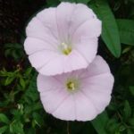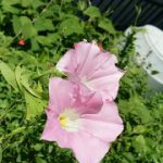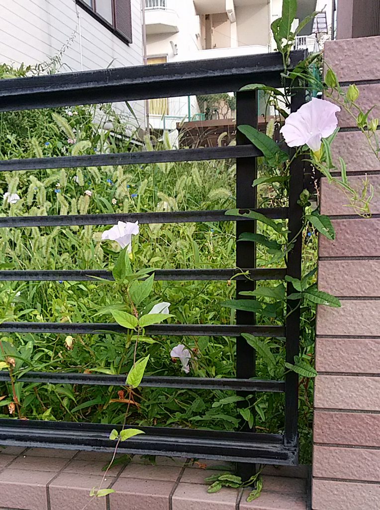 近畿以東の各地に大きな爪痕を残して去っていった颱風も被害に遭われた方々にはお気の毒でしたが、最近雨に恵まれず困っていた私達には旱天の慈雨とも謂うべき神様の贈り物でした^^。プランターの花と違って誰からも水を貰えないため萎れて居た雑草達も此の雨で急に元気を取り戻し僅か4日で私の肩までも成長しました。少し伸び過ぎだし昨年に倣って雑草退治をシルバー人材センターに依頼したら今年は猛暑で注文が多く作業は月末になるそうで、もう少し早く声を掛けとくべきだったと後悔しています。今週の花はヒルガオです。この花も私の好きな月見草の仲間でしたね。今年に限って何故か大量咲きで1日に20輪位庭中の汎ゆる雑草に蔓を巻き付いて花を覗かせて居ますから此れまで長年に亘って宿根が少し宛庭中に行き渡ったせいだと思います^^。