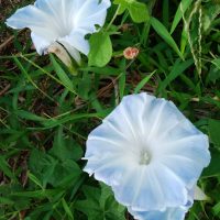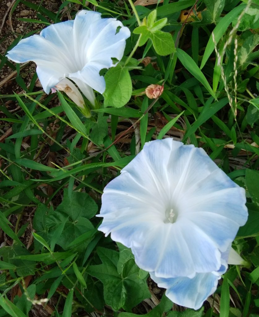 先月初めだったか土手上の白い朝顔をご紹介しましたね、あれからずっと気になって居て朝の散歩でハイツに備えた防火用水に孑孑(ぼうふら)退治用に飼っている金魚に餌の赤虫を遣るついでにその水を毎朝朝顔に与えていたら毎朝少し宛花に色が戻ってきて颱風の後遂に水色の朝顔が咲きました^^。水分不足で着色できなかったみたいです。水色は私の好きな色でもあり、思わず♪君に逢ううれしさに…♫とつい「水色のワルツ」を口遊んでしまいました。そして此の美しい水色の花は遠く彼方へ過ぎ去って二度と帰らない60年前のキラキラ輝いた青春時代に寸時私を誘(いざな)って呉れたのでした(^0^)/。