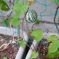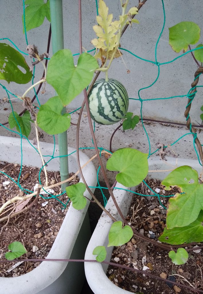 写真の西瓜は先週郵便局へ行った帰りに見付けました、可愛いいな^^。うちから30m離れて角にあるTさんの勝手口のプランターに生っていました。ちゃんと蔓が付いていたから偽物じゃないよ、ピンポン玉の二倍くらいの可愛い奴でしたが翌日もう一度見に行ったら何故かなくなってたので気になっています。誰かに盗られたんかしら?