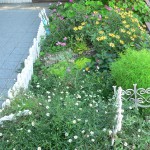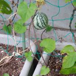 先月初旬雑草だらけの庭の隅に何故か突然かぼちゃが一本生えて伸びた蔓が雪桜の茂みに当たったので蔓は仕方なく茂みに伝って上に登りやがては反対側に降り、花を咲かせ実が実りましたが庭には他にかぼちゃが植わって居ないので南瓜の自家受粉は近親相姦になりますから良く実ったもんだと感心して居ます。雪桜と楓の後ろにあって気付くのが遅く、雑草を抜いて居たら野球のボール位になってぶら下がって居るのを見つけました^^。此の儘では大きくなって重みで蔓が切れそうに思え、急遽雪桜の枝を落としたりして背を低くし受け皿を作って落ち着かせました^^。写真は10日間位間隔があり少し大きくなりましたが、奇形児にもならずに育っていますが肥料をやったわけでもないためもうこれ以上大きくならないようです(;;)。2回の大きな颱風にもブロックで囲ってやって何とか無事でした^^。でも最近近隣に洗い熊が出没して居るから熟さない間に食べられるのは嫌だから茎も枯れたことだしもう成長しないと思うので収穫しようと思っています。
