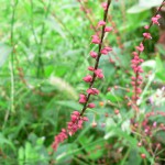 事務所玄関のプランターでは芒の花の中を掻き分け「みずひき」が花を付けています。細い穂状の花で慶事の金封などに用いられる「水引き」に見立てたことが名前の由来のようです。今の事務所ができた20年前、お嫁に行くまで居てくれた Nさんが土山の自宅からわざわざ1kgもある重い株を持参して呉れ植えた名残りです。可愛い花なんですがとても繁殖力の旺盛な草で瞬く間に庭中を跋扈してしまったので止めるのに懸命でした。それでもタネが飛んで未だにこうしてあちこちから顔を出します。道を通る方には珍しいらしく「可愛い花ですね何という花ですか?」とよく聞かれますよ^^。