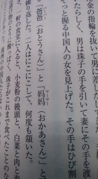 中脇初枝の「世界の果てのこどもたち」を読んでいたらお父さんお母さんのことを「パパ」「ママ」と中国語で話している言葉が書かれていました\(◎o◎)/!知らなかった!パパママは中国語やったんや!英語やと思ってたのに…、アメリカでは「ダディ」「マミー」やもんな。此れまで上流階級のアメリカ人を真似て子供達に「パパ」「ママ」と呼ばせていた知的な親たちはこの言葉が中国語と知らされてはショックで真っ青やろね^^。慌てて「お父ちゃん」「お母ちゃん」と言わせたりして…(;;)。