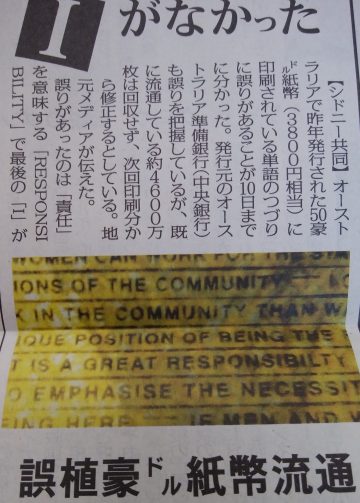 昨年秋に発行されたオーストラリアの50ドル紙幣の中の言葉に誤植がありResponsibility(責任)の字の中の i が一本抜けていることに気付いた人がラジオ局に通報したそうですが中央銀行は回収しないことにしたそうです、無責任な国やね(;;)。