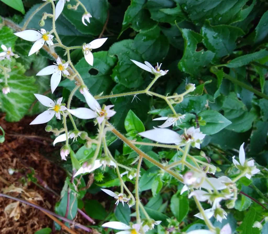 事務所の庭では漸く生育を始めた西瓜の苗の傍らでヒメウツギの咲き終わったのを見図ったように何処から飛来したのか分かりませんが 「ゆきのした」が一株芽生えて咲き出しました^^。お茶会にでも生けられそうな寂しげで可憐な日本の花です。此の花は日陰の庭などでひっそり咲くのが慣わしですから、日陰の場所なら何処にでもあるのに、どうして選りに選って日当たり抜群のこの場所を選んだのか謎ですが咲いたことは事実ですからそれはそれで喜ばしく早速スマホの餌食となりましたので皆様にご紹介しましょう。でも晴天続きでお日様が強くて曇り空も少なく僅か1週間で可哀想に萎れてしまいましたから梅雨が済んだら何処か日陰に植え替えてやろうと思って居ます。