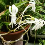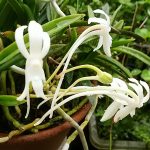 今年も毎年恒例の風蘭が咲いて呉れました^^。実(げ)に涼しげです^^。ずっと事務所玄関先を占領したススキのプランターの足元に置かれてあって影薄く昼間極々(ごくごく)僅かな時間しかお日様の当たらない環境が此の花には好ましく、この時期十日間だけひっそりと花を付けます^^。カトレアや胡蝶蘭に代表される豪華絢爛な西洋の蘭と違って我が国の蘭は総じて清楚で儚い中原淳一風の和風美人が多く鷺草、春蘭、ネジバナなどに共通する処は日本人が古来愛する「侘(わ)び寂(さ)び」ではないでしょうか。普段余り構って遣らなかったので少し拗ねて居るようです、今年は鉢の水苔を変えてやろうと思って鉢の中を探ったら水苔がなくて根だけで生きていました(;;)風蘭ちゃん放ったらかしてゴメンなm(_ _)m。早速1時間掛けて水苔を搾って根に巻き付けてやりました。来年もきっと咲いてね^^。