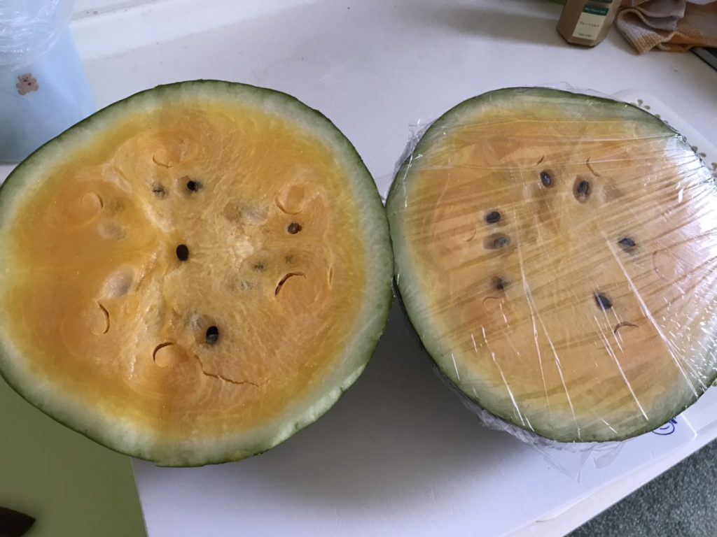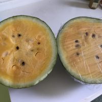 種なし西瓜の雄花の役目で植えられたのに健気にも自分の雄花と雌花で着果した西瓜は先々週木曜日に収穫されました^^。孫がこの翌日マダガスカルへ留学するので一口食べさせたかったのです。8キロ以上もあって急拵えの痩せた土で良くまあ育ってくれたと感心しています^^。種馬のため普段は必須とされて居る南瓜の接ぎ木苗ではなく純粋の西瓜苗だったので種が少なくシャリシャリと口の中で溶ける感触は紛れもなく子供の時食べた本物の西瓜の味でしたよ^^。受粉の種なしが赤だったのにこっちは何故か赤くなく黃色西瓜だったのにはビックリしました。
