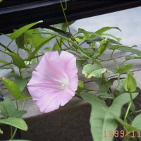 ずっと以前にお知らせしましたが学校から夏休みの宿題に1年生の孫が持ち帰った朝顔の苗の残りを樽プランターに植えたのが6月26日でした。もうお仕舞いかと来年の種を採っていたら今朝10日振りに葉も殆どないのに最後の花が咲きました。咲かなくなっても何時もの習慣で毎日牡丹や芍薬などに与えていたHB101〔土の栄養剤です〕の残りを掛けていたのが良かったのでしょう、然し最後の余力を搾って咲かせたものか花もこれまでの半分の大きさしかなく、折角咲いたのに生憎の雨に打たれてとても可哀想でした。(;;)