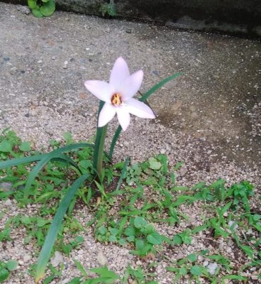 夏前に枯れた石蕗を抜き取ったあと誰も通らない土手上の畳一枚分空き地にハブランサスが一輪そっと咲いて居ました^^。種が風に吹き上がって飛んで行ったとしか思えませんが、私が見付けるまで誰にも観て貰えず本当にひっそりと寂しげで咄嗟にどうしてこんな処に!花って観てくれる人が居なくても咲くんやなあ !と思わず叫びました。ハブちゃん私に観て貰えて咲いた甲斐があったね^^、良かった良かった。