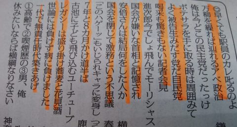 安倍さんが辞めた頃合いを計って金曜日「桜を観る会」出席写真をダシに2000億円掠め取ったジャパンライフの詐欺師たちが一斉に逮捕されましたが、安倍さん在位中は検察も忖度してたんやろうね、菅新総理の誕生でGOサインが出たと思われます。先週の万能川柳(選者の仲畑先生が多忙で投稿から校閲を経て掲載まで凡そ3週間を要しますから総理辞任表明を受けて投稿されたものです。