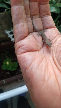 寒くて冷たかった先週月曜日の朝起きると、事務所玄関横に据えたメダカを育てるためのバケツ型の大水槽に張った氷の上で赤ちゃんヤモリが凍えて横たわって居るではありませんか(゜o゜;。冷たくなって動かないので何とか蘇生させようとストーブの傍らに置いてお湯を張った茶碗を添えて懸命に介抱して遣りましたが、午後になっても蘇生せず死んでしまったようなので、哀れに思い畑の一隅にお墓を造って祀ってやりました(;;)。ヤモリさん、来世きっとはトカゲに生まれ変わって下さいね(^0^)/。そうすれば仲間も沢山居るし昼間堂々と庭を闊歩して虫を沢山食べて長生きできますよ。