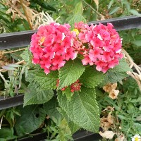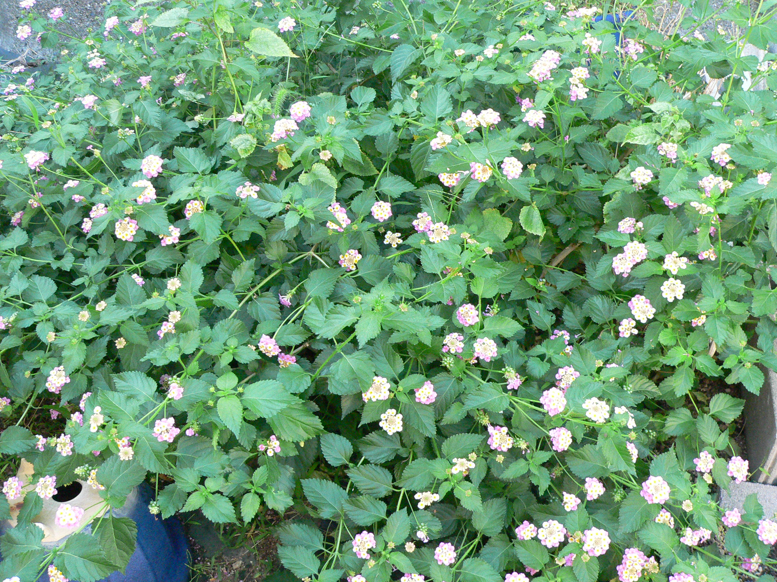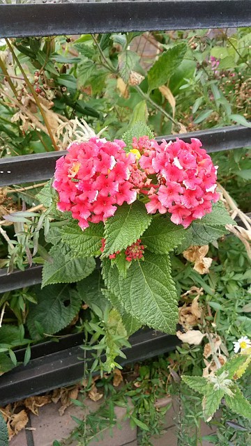 一度は根から全部抜いて根絶したはずのランタナの根っこの欠片がしぶとく生き残っていたらしく雌伏三年、東の庭から道路に顔を出して花を付けました(::)。本当は可愛い花なんですが繁殖力の旺盛さからどこでも嫌われる花です。昔10年くらい前に駅前東口バス発着場のコンクリート割れ目から咲いている花の生命力に感動し先っちょを10cm程失敬して挿し木をしたのが過ちのもとで庭中飛び火して私の大きな後悔となったのですが、その後懸命に撤去に務めたが未だに根っこの端が残っていての発芽でありました(;;)無念!