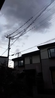 夕間暮れとでも言うのか夕暮れの薄暮どきに事務所の玄関先に立っていると物凄い数の小鳥が飛来した、そしてその極一部がうちの前の電線に止まった、そして口々に何やら囀(さえず)って居る。姿は薄ぼんやりとしか見えないが雀より少し大きく明らかに鵯(ひよどり)の声だ、塒(ねぐら)に帰る途中だと思うが、何思ってうちの前で一服したか、黄昏どきで見え難いが前の方の電線にも沢山止まっているからざっと百羽位は居る、飛んでいたのは全部で幾羽だったんだろう?、彼等が昼間はどこに居るのか考えたが検討もつかない、真っ黒の鳥だから雀と間違うことはないし、普段飛んでいる鵯はもっと大きい奴を時折見掛ける位だ、こんなに沢山の鳥から眺められるとヒッチコックの「鳥」を思い出してしまう、あれは実に怖い映画だったね。