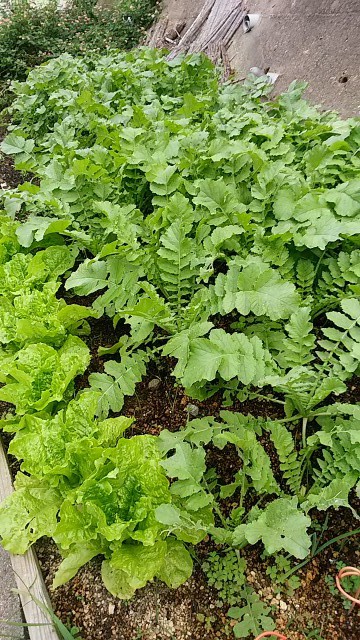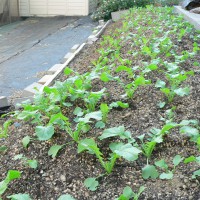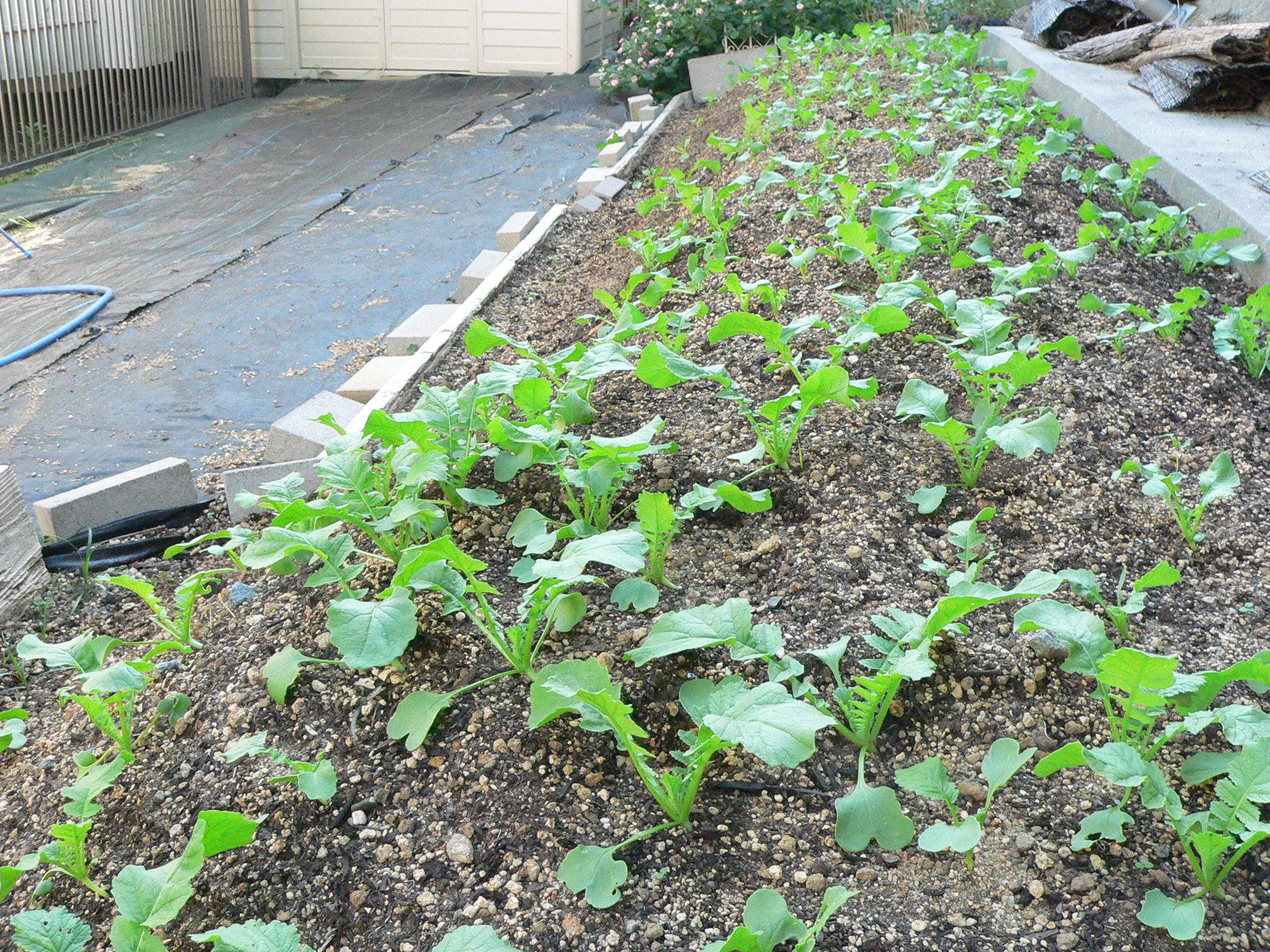 今年の大根はなぜか昨年と違って発芽率が100%だった、そんなに発芽すると思ってなかったのでテキトーに蒔いたのがアダとなり数回間引く羽目になって現在に至っているが、半月もしたらもう一回くらい間引く必要がありそうだ。間引き大根の根っこは辛くて食べられたものでなかったが葉はメチャ柔らかく美味しかった、栄養価も満点らしい^^沢山の方に差し上げて喜んで頂いた^^。