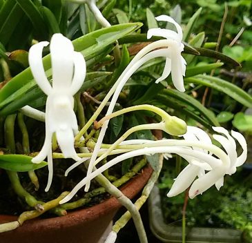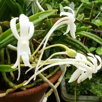 玄関先に年中放置されて居る風蘭が暑い暑い中を今年も忘れず先週大雨が止んだのを待っていたようにその可憐な花を咲かせました^^。長咲きのランにしては「命短し恋せよ乙女」であって僅か3日の命でしたが、この花を見ると何故かホッとします。清純な乙女の佇まいが得も言われぬ風情でしたよ。