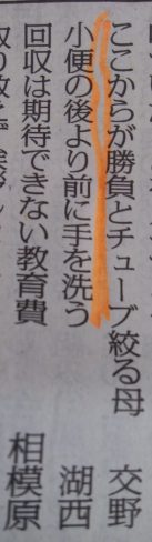 変わった川柳ですね^^。此の川柳の意は、普段日常生活や仕事などで絶えず色んなものに触れ両手には雑菌が一杯付いて居るから雑菌を下着の中に持ち込むのはとても危険なことだと言うことなんですが、小便は躰から出る老廃物であってもバイキンなど決して居ず、少し匂いがしても不浄なのは圧倒的に手の方なので先に手を洗えと此の川柳は言って居ます。???、でも何処に行ってもトイレの前に手を洗う人って居ませんよね。先日市民病院でも注意してよく見渡したが、矢張りトイレの何処にもそんな注意喚起は見付かりませんでした。今度行ったら此の川柳のコピー張っとこうかしら^^。後で手を洗うリスクは圧倒的に女性の方が高そう…(;;)。私が思うにトイレの前後二回手を洗うのが最も安全ではないでしょうか。