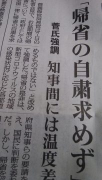 「故郷(ふるさと)は遠きにありて思うもの…」私達も青春時代一度は口遊(ずさ)んだ室生犀星の名詩小景異情に載せられた有名なフレーズですが、現在は小池都知事の発するお盆の帰郷を考える都民や都を訪れようとする方へのキャッチフレーズとなって居ます。観光産業から貰った僅か4200万円の政治献金に対し、189億円もの観光助成金を出すことになった安倍総理のGOTOトラベルに対し、東京への不要不急の往還を避けるようにとの小池都知事のコロナ拡大を憂える痛切な要請メッセージから緊迫した鍔迫り合いを重ねていますが、健康を取るか、経済を取るか、此の大命題はもう少しすれば小池都知事の圧勝に終わることでしょう。日本経済は健康な日本人の存在を前提としたものでないと成り立たない肝腎なことが頭の悪い総理や官房長官に見落とされて居る結果です(;;)。