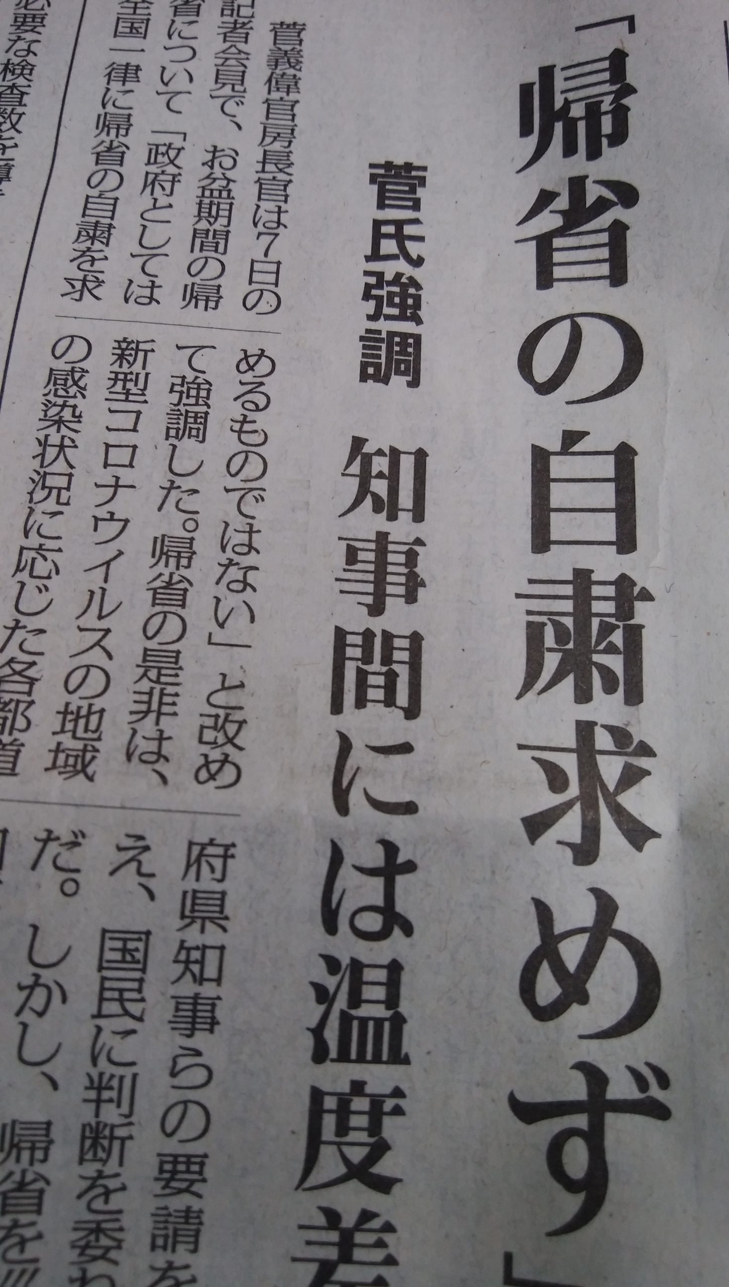 それにしても自民党の仲間である公明党の山口代表が見兼ねて「国民のせいだ…」「都の問題だ」と啀(いが)み合っている場合ではないだろう!」と苦言を呈したのは令和の大久保彦左衛門の登場でしたね^^。安倍総理は早急に臨時総会を開催し、コロナによる緊急事態宣言を発令し病床や医療関係者の確保充実を法制化して下さい!7日記者会見で「帰省の自粛を求めない」との官房長官の発言はコロナ蔓延を軽視した暴論だったが、彼が総理の幇間であっても其処まで言うか!実は此の二人が怖いのは経済悪化に拠る税収不足なんですがそれを言うとお郷里(さと)が知れるので経済に摺り替えるあざとさは見事なもんやね💢。経済界を活性化させるには消費税の減税が劇的な特効薬ですが、それを言わない此の二人の意図が皆様はきっとお分かりですよね💢。