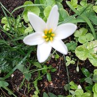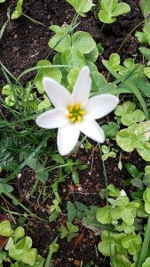 先週南の庭と東の庭同時に見知らぬ白い花が咲きました。スマホの「花ノート」で調べると「ゼフィランサス」だそうです(^^)。何処から跳んできたのかまるで分かりませんが鳥か蜂が種を運んできたものだろうと思いました。同じ日に花が咲いたのは種の運び主が同じだったからでしょうが、日当たりが違うので土の環境が同じだったとしてもとても不思議に感じたものです。
