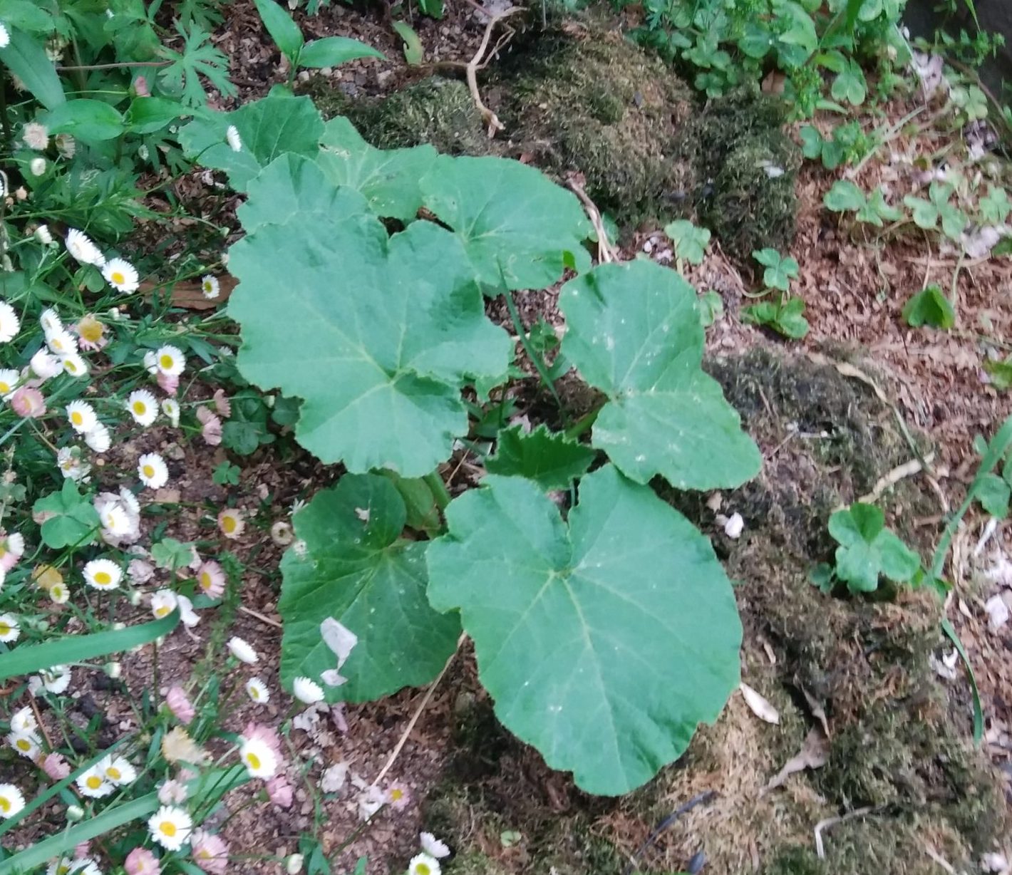 何故か知らぬがカボチャの苗が生えてきました!先日までラナンキュラスが群生して百花爛漫だった事務所玄関前の花壇です。ラナンキュラスの花が終わり後片付けをして暫くしたら小さい苗が芽を出したので石蕗の子供かな?と思っていたらみるみる大きくなってどう見てもカボチャではありませんか!ラナンキュラスは私に無断で家族が植えて居たので今回もそうだと思って詰問したら誰も「知らん!」と言います。前の道から種を植える人など居る訳がないし、数日考えた結論は3月初旬に家庭調理ゴミを処理するディスポーザーから熟成堆肥を取り出し庭のあちこちに寒肥として施したことがありその際腐りきってなかったカボチャの種があったのではないかと想像しました。ディスポーザーは上から生ゴミを容れて下から堆肥を出しますから二年以上掛かって出てくる計算ですが、「種」って生命力が強いから腐らずに生き続けていたのでしょう。母性本能とでも言うのか、悪環境の元で宿る恐るべき生命力は驚きです! どんなカボチャが生るのか楽しみにしよう^^。